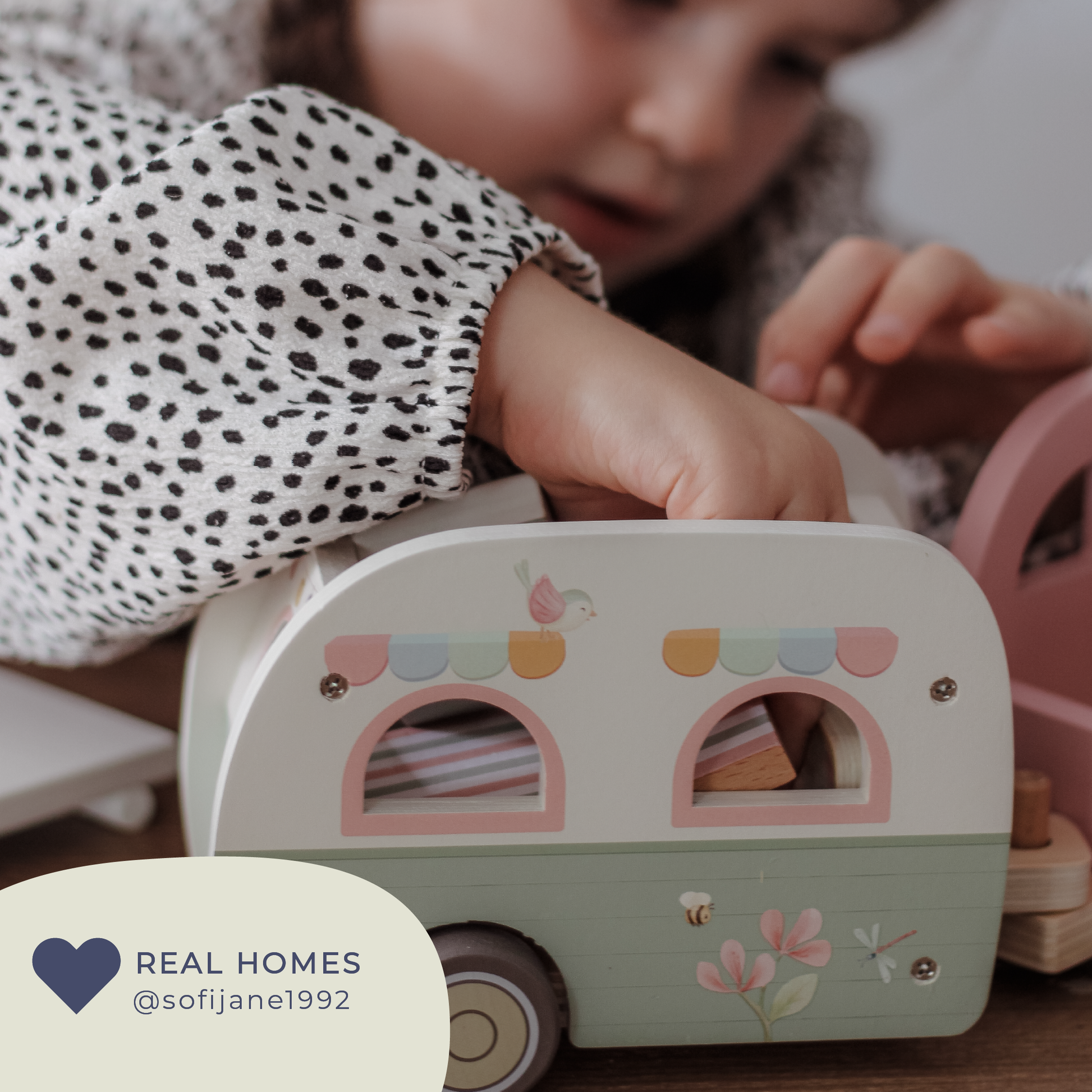 Let's make a dream trip and go on the road! Discover the adventurous world with the cute pink car with caravan and enjoy freedom. With the caravan you turn every place into a camping spot, wherever you want. Whether it is the living room, the playroom or the kitchen, remove the beach chair, pack the suitcases and let the 3 wooden figures enjoy the surroundings.